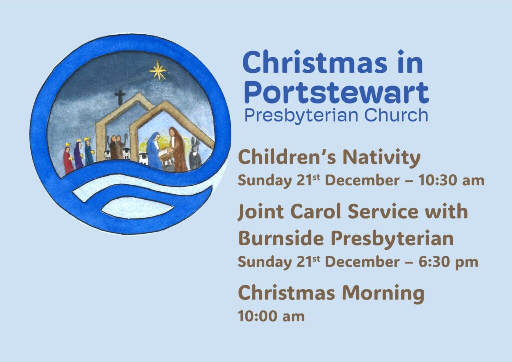 This year we are looking forward to another family Christmas celebration in Portstewart. Our Nativity service will be on the morning of Sunday 21st December at 10:30 am followed by a seasonal cup of tea and an opportunity to tell our children how well they did. This year our annual carol service is a joint service with Burnside Presbyterian Church. The service is at 6:30 pm on Sunday 21st December in Portstewart Presbyterian Church.