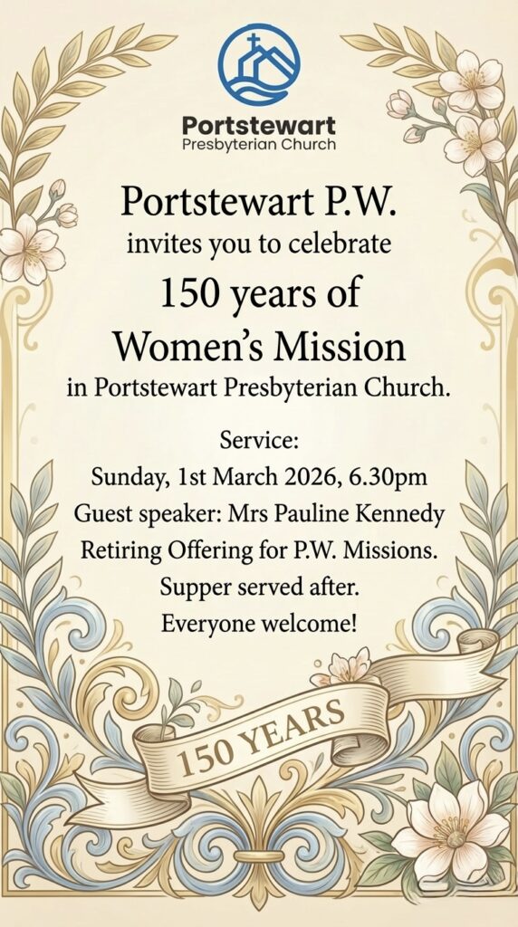 Portstewart Presbyterian Women warmly invite you to a special Service of Celebration marking 150 years of Women’s Mission in Portstewart Presbyterian Church.